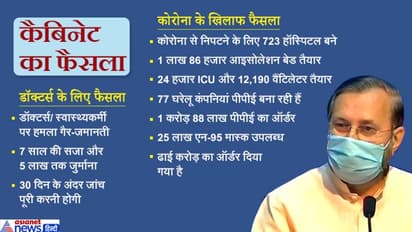 प्रकाश जावड़ेकर ने कहा, महामारी रोग अधिनियम 1897 में संशोधन और अध्यादेश लागू किया जाएगा। डॉक्टरों और स्वास्थ्यकर्मियों पर हमला गैर-जमानती होगा। 30 दिनों के भीतर जांच की जाएगी। आरोपी को 3 महीने से 5 साल तक की सजा हो सकती है और 50 हजार से लेकर 2 लाख रुपए तक पेनाल्टी लगाई जा सकती है। मंगलवार को अमित शाह ने वीडियो कॉन्फ्रेंसिंग के जरिए इंडियन मेडिकल एसोसिएशन (IMA) और डॉक्टर्स से बात की थी और उन्हें सुरक्षा का आश्वासन दिया।