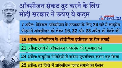 इसके बाद पीएम मोदी ने 22 अप्रैल को ऑक्सीजन की आपूर्ति और इसकी उपलब्धता को बढ़ाने के तरीकों और उपायों की समीक्षा करने के लिए एक उच्चस्तरीय बैठक की अध्यक्षता की थी। इसमें उन्होंने ऑक्सीजन की आपूर्ति में सुधार के लिए उठाए जा रहे कदमों की जानकारी ली थी। इस दौरान पीएम मोदी ने अधिकारियों से ऑक्सीजन का उत्पादन बढ़ाना, वितरण की गति बढ़ाना और स्वास्थ्य सुविधाओं के लिए ऑक्सीजन की सहायता प्रदान करने के लिए नए तरीकों के इस्तेमाल करने के लिए भी कहा था।