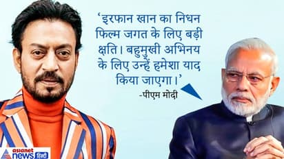पीएम ने ट्वीट किया, इरफान खान का निधन सिनेमा और रंगमंच की दुनिया के लिए एक क्षति है। उन्हें विभिन्न माध्यमों में उनके बहुमुखी अभिनय के लिए याद किया जाएगा। मेरी संवेदनएं उनके परिवार, दोस्तों और प्रशंसकों के साथ हैं। उनकी आत्मा को शांति मिले।
