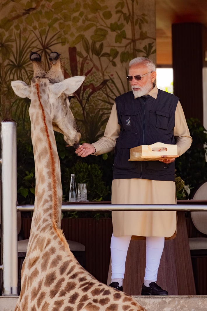 नरेंद्र मोदी ने जिराफ को प्यार से खाना खिलाया।