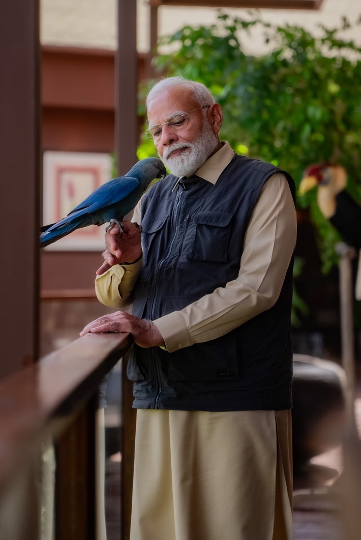 Spix’s Macaw पक्षी नरेंद्र मोदी के हाथ पर बैठ गया।