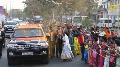 प्रधानमंत्री की कार पास आई तो महिलाओं ने उसपर गुलाब की पंखुरियों की बारिश कर दी। कार के अंदर से ही पीएम ने हाथ जोड़कर महिलाओं को प्रणाम किया।
