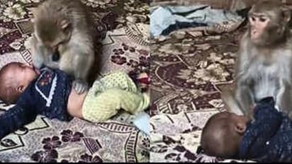 परिवार वालों ने 3 महीने के बच्चे को जमीन पर लिटाया था और पास में ही काम कर रहे थे। तभी अचानक एक बंदरिया वहां आ गई। वो बच्चे के साथ खेलने लगी। हैरानी की बात यह है कि बच्चा भी रोया नहीं, बल्कि बंदरिया के साथ खेलने लगा। बंदरिया बच्चे को दुलार कर रही थी और प्यार से ऐसे थपकी दे रही थी, जैसे कोई मां अपने बच्चे को देती है। कुछ देर बाद जब परिवार वाले लौटे, तो बच्चे के पास बंदरिया को देखकर उनके होश उड़ गए। उन्होंने बंदरिया को भगाने की कोशिश की, लेकिन इससे वो और गुस्सैल हो गई। जैसे कोई मां अपने बच्चे को बचाने के लिए आक्रामक हो जाती है, ठीक वैसे ही बंदरिया भी काटने के लिए दौड़ने लगी। यह सब देखकर बच्चा भी जोर-जोर से रोने लगा। बच्चे को रोता देख बंदरिया को लोगों पर और गुस्सा आ गया, शायद उसे लगा कि उसकी वजह से उसका 'बच्चा' रो रहा है।