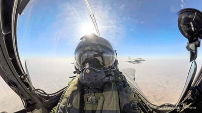 गणतंत्र दिवस समारोह के दौरान भारतीय वायु सेना की पूर्व-रिकॉर्ड की गई फ्लाईपास्ट का हवाई दृश्य।