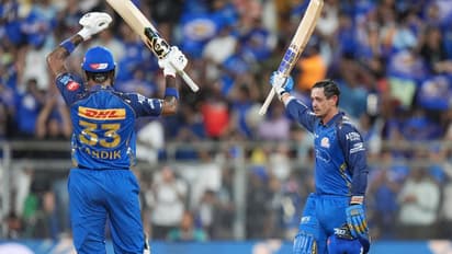 मुंबई: पंजाब किंग्स के खिलाफ गुरुवार को हुए मैच में मुंबई इंडियंस के ओपनर क्विंटन डी कॉक ने धमाकेदार सेंचुरी जड़ दी है। इस पारी के साथ ही उन्होंने कई बड़े रिकॉर्ड अपने नाम कर लिए। यह इस IPL सीजन में डी कॉक का पहला ही मैच था और उन्होंने मिले मौके का पूरा फायदा उठाया। जब मुंबई की टीम 12 रन पर 2 विकेट खोकर मुश्किल में थी, तब डी कॉक ने पारी को संभाला। उन्होंने 17वें ओवर में बार्टलेट की गेंद पर चौका लगाकर सिर्फ 53 गेंदों में अपनी सेंचुरी पूरी की। इस मैच में डी कॉक 60 गेंदों पर 112 रन बनाकर नॉटआउट रहे, जिसमें 8 चौके और 7 छक्के शामिल थे।