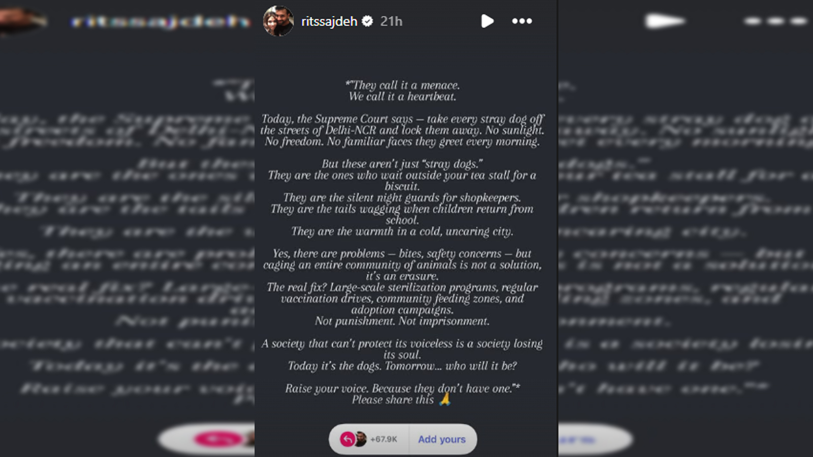 रितिका सजदेह ने अपने इंस्टाग्राम अकाउंट पर एक पोस्ट शेयर की है। इसे शेयर करते हुए उन्होंने सुप्रीम कोर्ट के आदेश का विरोध किया। उन्होंने लिखा- आवारा कुत्ते सिर्फ सड़क पर भटकने वाले जानवर नहीं बल्कि शहर की धड़कन है। यह वही है जो चाय की दुकान पर बिस्किट का वेट करते हैं, दुकानदारों के लिए रात में पहरा देते हैं। बच्चों को स्कूल से लौटते देख खुशी से पूंछ हिलाते हैं और अपने होने से माहौल में अपनापन भरते हैं।