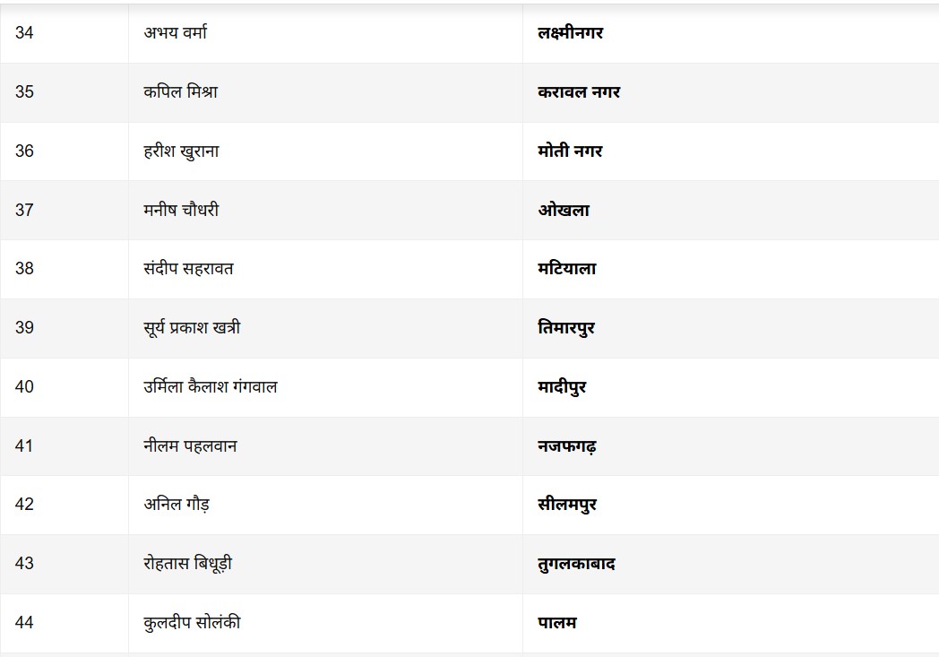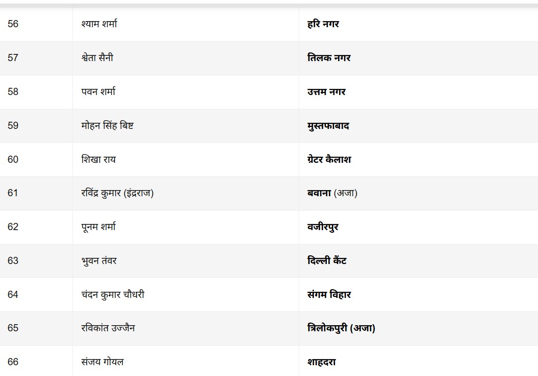 नई दिल्ली। दिल्ली विधानसभा चुनाव 5 फरवरी से होने जा रहे हैं। इससे पहले बीजेपी, आम आदमी पार्टी औऱ कांग्रेस के बीच जमकर घमासान देखने को मिल रहा है। बीजेपी ने 70 में से अपनी 68 सीटों पर उम्मीदवारों को उतार दिया है। पार्टी की तरफ से गुरुवार के दिन चौथी लिस्ट जारी की गई थी, जिसमें कई चेहरों को जगह दी गई। लेकिन दो सीटों को बीजेपी ने अपनी सहयोगी पार्टियों जेडीयू और एलजेपी (रामविलास) के लिए छोड़ी है। इन सीटों के नाम बुराड़ी और देवली है। ऐसे में आइए जानते हैं कि कौन-कौन सी 68 सीटों पर बीजेपी ने उतारे कौन-कौन से उम्मीदवार।