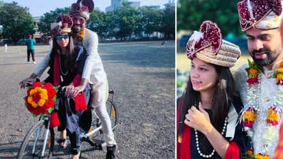 इंदौर. मध्य प्रदेश के इंदौर में एक अनूठी शादी(Unique wedding indore) चर्चा में है। आमतौर पर दूल्हा अपनी दुल्हन को किसी महंगी और लग्जरी गाड़ी से ब्याह कर ले जाता है, लेकिन यहां साइकिल को डोली बनाया गया। दूल्हा साइकिल के डंडे पर दुल्हन को बैठाकर ले गया। यह शादी 9 जून को देखने मिली। इंदौर खंडवा रोड स्थित साईं बाग कालोनी के रहने वाले अमोल वाधवानी साइकिल से 3 किमी दूर खातीवाला टैंक क्षेत्र में डिम्पल भाटिया के घर अपनी बारात लेकर पहुंचे थे। ये तस्वीरें सोशल मीडिया पर वायरल हैं।