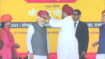 संबोधन से पहले प्रधानमंत्री ने आरती और घंटे घड़ियाल बजाकर भगवान देवनारायण का पूजन किया।