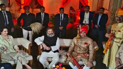 शादी में दूल्हे अविजित के साथ बैठे राहुल गांधी और प्रियंका गांधी, साथ खड़े पूर्व केंद्रीय मंत्री जितेंद्र सिंह।
