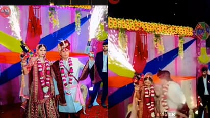 वायरल न्यूज,newlywed couple narrowly escapes sparkler gun accident । शादियो में कुछ नया करने की सनक कभी-कभी भारी भी पड़ सकती है। मौजूदा दौर इवेंट कंपनियां दूल्हा - दुल्हन को एक टूल की तरह इस्तेमाल करते हैं। ऐसी कंपनियां मोटी रकम लेकर शादी या दूसरे इवेंट आयोजित करती हैं, फिर लोगों का अट्रेक्शन पाने के लिए इसमें कुछ ऐसे टेविस्ट जोड़ देते हैं, जो एक्सीडेंट का कारण बनते हैं।
