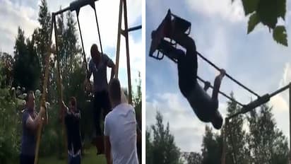 इस वीडियो को ट्विटर पर @NoContextHumans नाम के पेज से शेयर किया गया है, जिसे 5 लाख बार देखा जा चुका है। वायरल वीडियो में नजर आता है कि एक शख्स झूले पर खड़े होकर उसमें 360 डिग्री झूलने लगता है। दो तीन राउंड झूलते ही उसका हाथ छूटता है और वह सिर के बल सामने की दीवार से जा टकराता है। ये देख उसके दोस्तों की चीखें निकल पड़ती है।