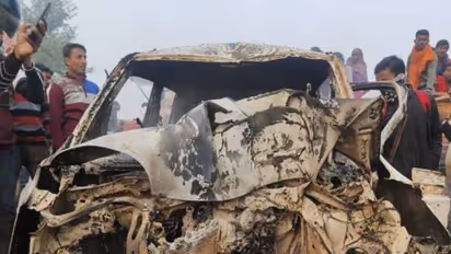 हाईवे किनारे पेड़ से टकराई कार में लगी आग, जिंदा जले तीन लोग, सिर्फ बची खोपड़ी
