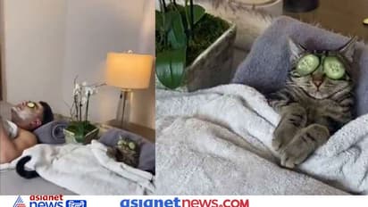 वीडियो में बिल्ली मजे से बेड पर लेटे हुए स्पा लेते और आंखों पर खीरे रखे हुए दिखाई दे रही है। आपने पता नहीं इतने सुकून से स्पा लिया होगा या नहीं लेकिन इस बिल्ली को देख आप जरूर मुस्कुरा रहे होंगे। ये वीडियो खूब शेयर हो रहा है। मजा तो तब आया जब महिला कमरे में घुसी और बिल्ली की आंखों से खीरे हटा दिए।