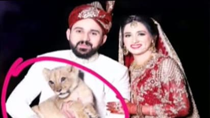 शादी में शेर के बच्चे के साथ दूल्हा-दुल्हन ने खिंचवाई तस्वीर, पड़ गया भारी मुसीबत में