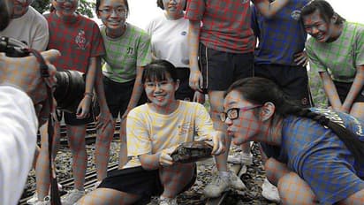 इस तस्वीर में बच्चियों का एक झुंड बैठा नजर आ रहा है। इन बच्चियों के हाथ में एक कछुआ है, जिसके साथ वो पोज कर रहे हैं। एक कैमरामैन उनकी फोटो ले रहा है।