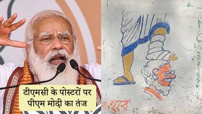 उन्होंने कहा, दीदी अगर आप चाहती हैं तो आप अपना पैर मेरे सिर पर रख सकती हैं, मुझे लात मार सकती हैं। लेकिन दीदी मेरी दूसरी बात भी कान खोलकर सुन लीजिए। मैं आपको अब बंगाल के विकास को लात नहीं मारने दूंगा। मैं आपको बंगाल के सपनों को लात नहीं मारने दूंगा। दरअसल, टीएमसी ने चुनाव प्रचार के दौरान विवादित पोस्टरों का इस्तेमाल किया है। इनमें पीएम मोदी के सिर पर ममता को पैर रखे हुए दिखाया गया है।