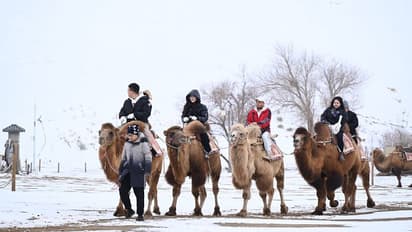 इस वर्ष नवंबर के अंत में होने वाली बर्फबारी के कारण पर्यटक यहां ऊंट की पीठ पर सवारी करते हुए इस दृश्य का आनंद ले रहे हैं।