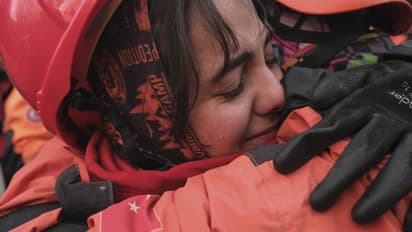 करीब 96 घंटे बाद तुर्की के हटे में गिरी इमारत के मलबे से जब इस महिला को जिंदा बाहर निकाला गया, तो वो रेसक्यू टीम से चिपकर रो पड़ी। (AA फोटो)