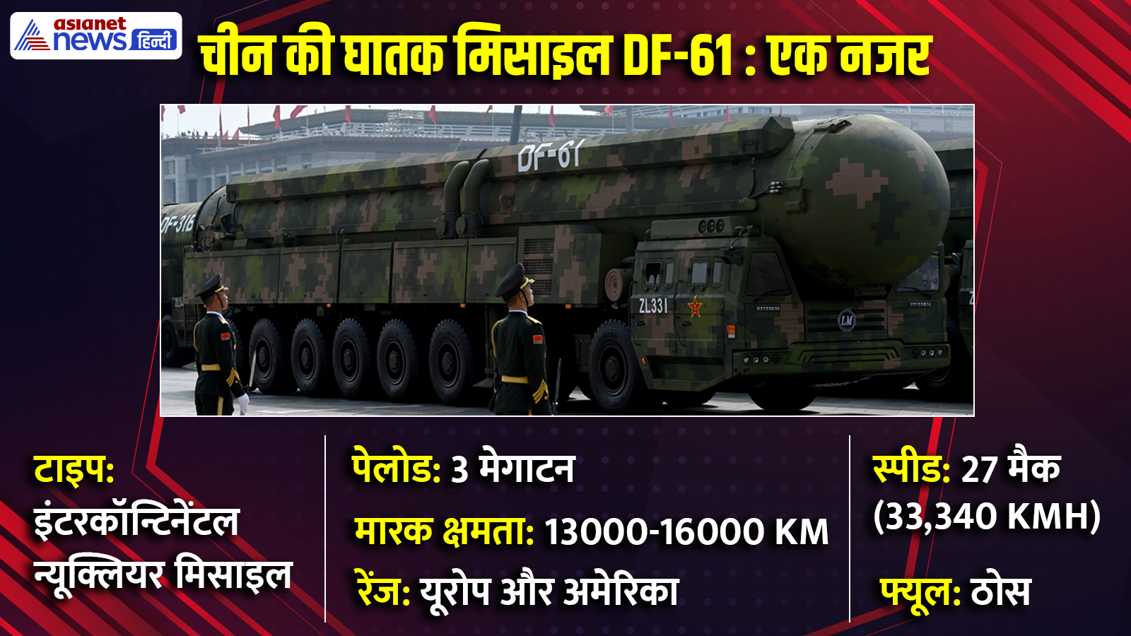 DF-5C (डोंगफेंग 5) चीन की एक शक्तिशाली इंटरकॉन्टिनेंटल न्यूक्लियर मिसाइल है, जो भारी मात्रा में परमाणु पेलोड ले जाने में सक्षम है। विक्ट्री डे परेड के दौरान अब चीन ने इसके DF-41 के एडवांस्ड वर्जन DF-61 को दिखाया। ये ठोस ईंधन वाली ICBM मिसाइल है, जो चीन के न्यूक्लियर वेपंस में सबसे नई है। ये मिसाइल 3 मेगाटन परमाणु हथियार ले जाने में सक्षम है। वहीं, इसकी मारक क्षमता 13,000 से 16,000 किलोमीटर तक है। यानी चीन के इस खतरनाक हथियार की जद में पूरा यूरोप और अमेरिका आते हैं। इसकी स्पीड 27 मैक (33,340 किलोमीटर/घंटा) से भी ज्यादा है। ये दुश्मन देशों के एयर डिफेंस सिस्टम के लिए बड़ी चुनौती होगी।