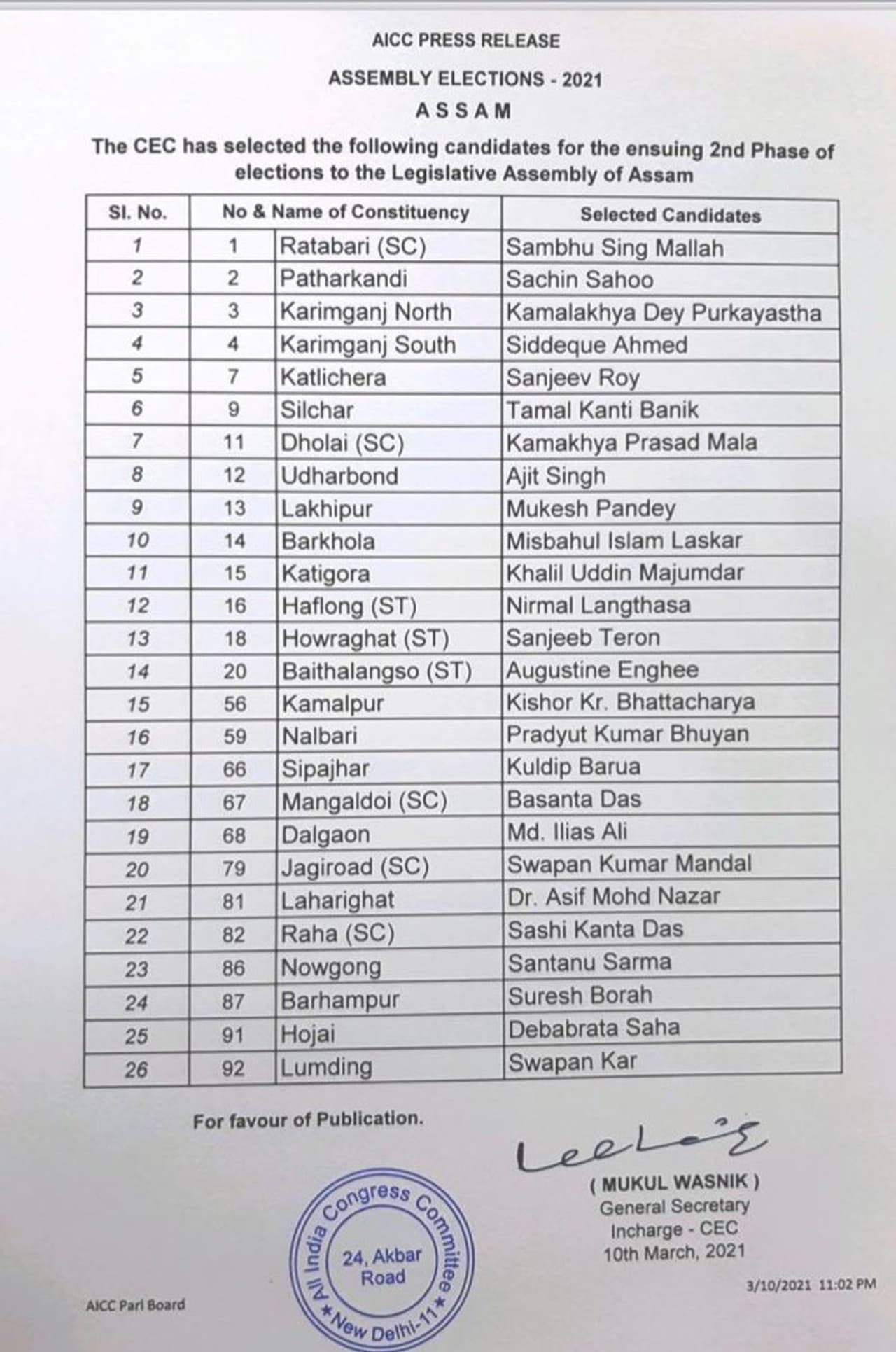 असम में 126 विधानसभा सीटों के लिए तीन चरणों में होने जा रहे चुनाव के दूसरे फेज के लिए कांग्रेस ने 26 प्रत्याशियों की लिस्ट जारी कर दी है। अब तक पार्टी 69 प्रत्याशियों की घोषणा कर चुकी है। लिस्ट में 5 मुस्लिम उम्मीदवार भी शामिल हैं।