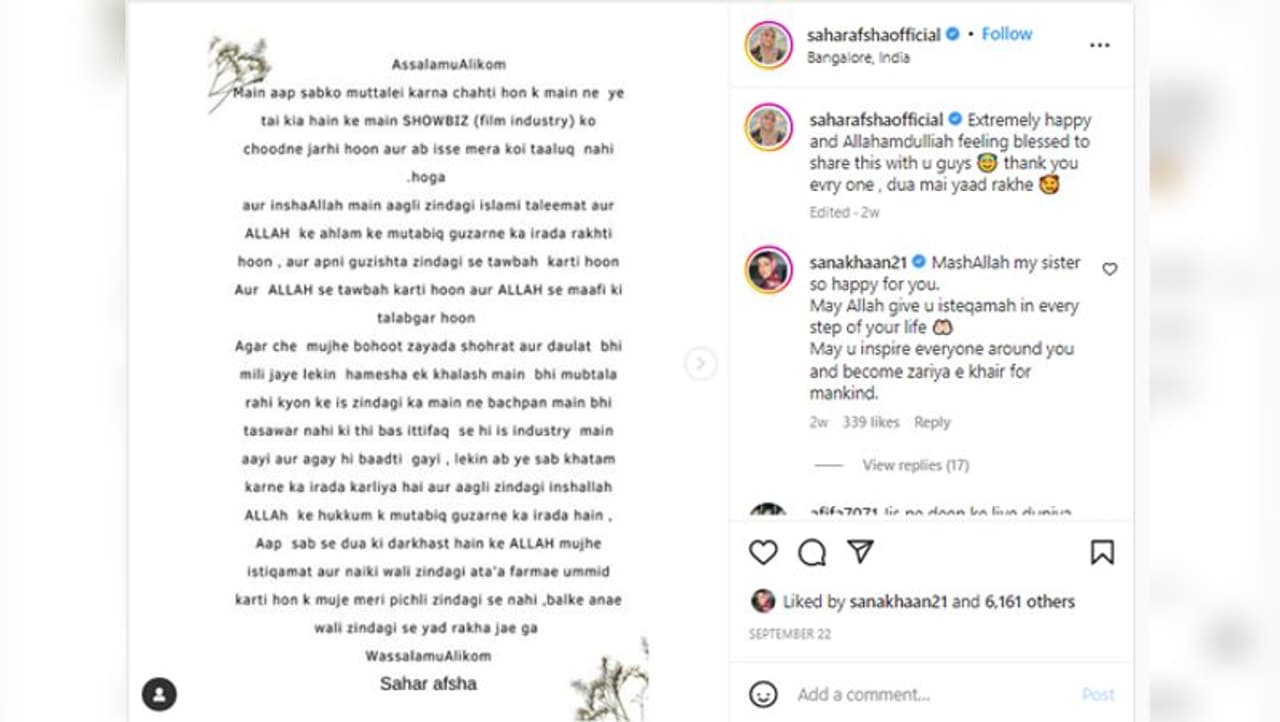 सहर अफशा ने अपनी पोस्ट में लिखा है, "मैं आप सबको यह बताना चाहती हूं कि मैंने यह तय किया है कि मैं शोबिज (फिल्म इंडस्ट्री) को छोड़ने जा रही हूं और अब इससे मेरा को ताल्लुक नहीं होगा और इंशाअल्लाह मैं अगली जिंदगी इस्लामी तालीमात और अल्लाह के अहलाम के मुताबिक़ गुजारने का इरादा रखती हूं और अपनी गुज़िश्ता जिंदगी से तौबा करती हूं। अल्लाह की तौबा करती हूं और अल्लाह की माफ़ी की तलबगार हूं।"