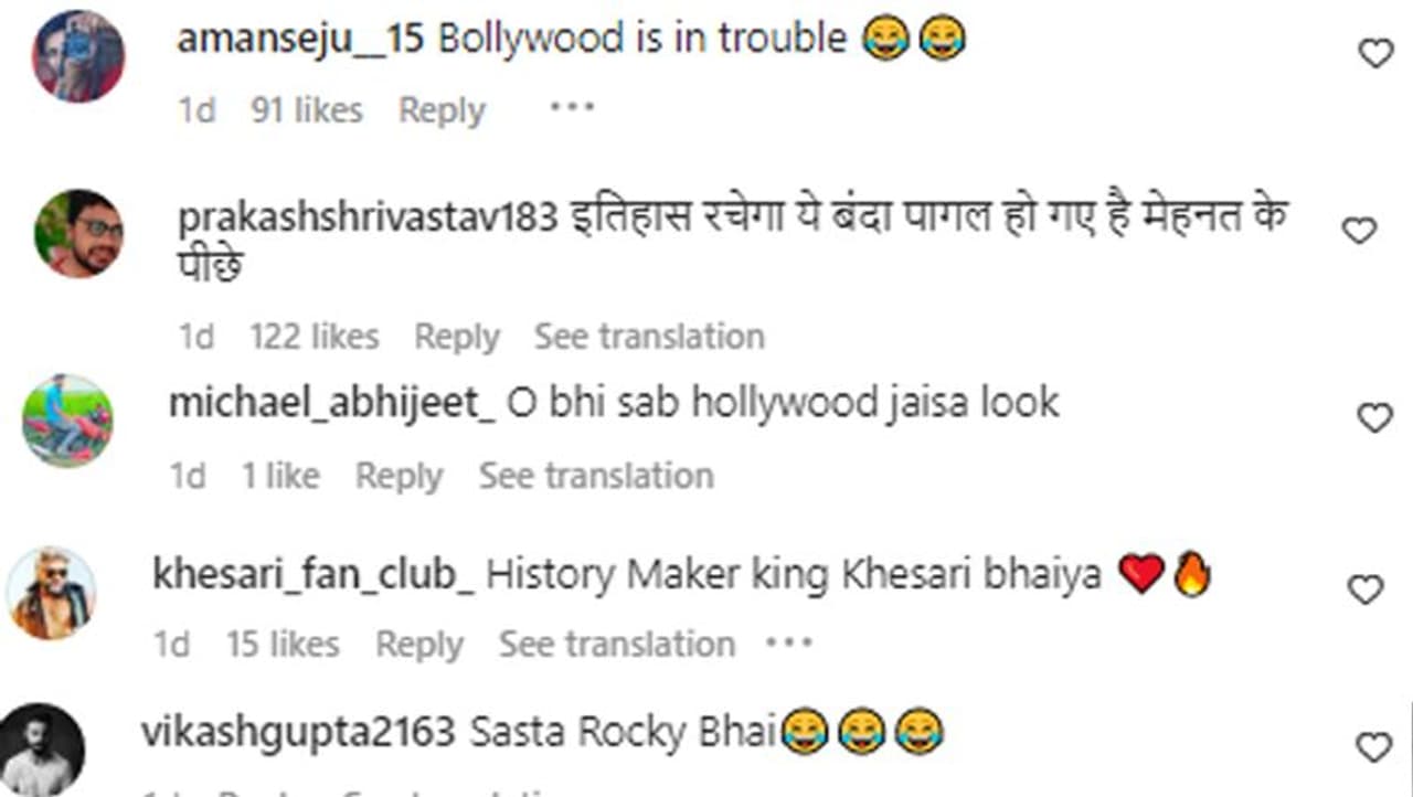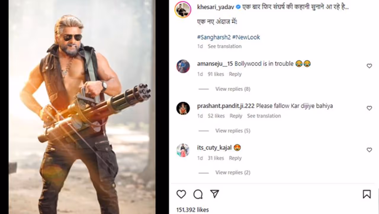 फोटो में खेसारीलाल एमजी ब्राउनी गन लिए नजर आ रहे हैं। इसमें उनका स्वैग किसी हॉलीवुड कलाकार से कम नहीं है। अगर आपको हॉलीवुड की फिल्म 'द लास्ट स्टेंड' का पोस्टर याद हो तो , जिसमें अर्नाल्ड श्वार्जनेगर ऐसे में लुक में दिखे थे। ठीक उसी तरह खेसारीलाल यादव भी नजर आ रहे हैं। पोस्टर देखने के बाद एक सोशल मीडिया यूजर ने लिखा है, "बॉलीवुड मुश्किल में है।" एक अन्य यूजर का कमेंट है, "इतिहास रचेगा यह बंदा, पागल हो गए मेहनत के पीछे।" एक यूजर का कमेंट है, "ओ भाईसाब, हॉलीवुड जैसा लुक। वहीं, एक यूजर ने लिखा है, "हिस्ट्री मेकर किंग खेसारी भैया।" एक यूजर का कमेंट है, "सस्ता रॉकी भाई।"