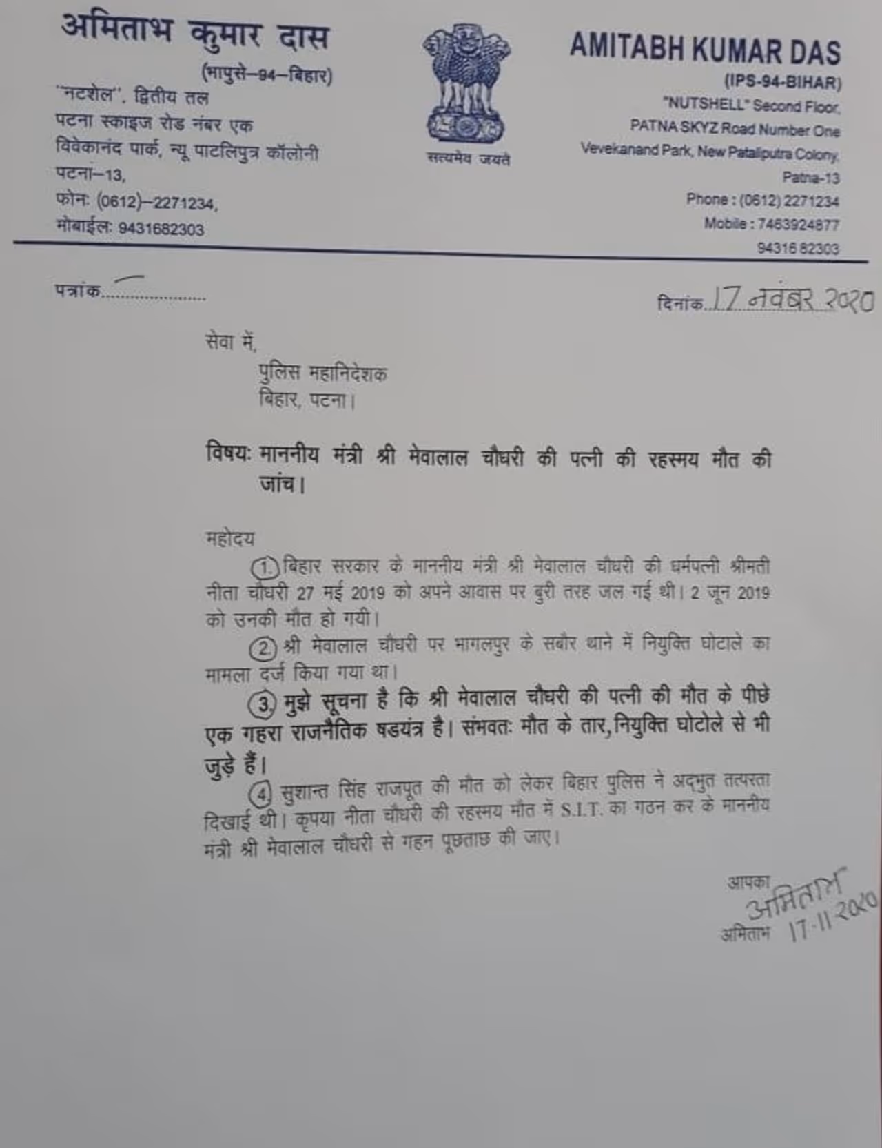 तारापुर के जेडीयू विधायक डॉ मेवालाल चौधरी कोइरी समुदाय से आते हैं। उन्हें पहली बार कैबिनेट में शामिल किया गया है। मेवालाल चौधरी की पत्नी स्व. नीता चौधरी राजनीति में काफी सक्रिय रही थीं। वे जेडीयू के मुंगेर प्रमंडल की सचेतक भी थीं। नीता चौधरी साल 2010-15 में तारापुर से विधायक चुनी गईं थी। लेकिन, 2019 में गैस सिलेंडर से लगी आग से झुलस कर उनकी मौत हो गई थी। हालांकि पूर्व आईपीएस अधिकारी अमिताभ कुमार दास ने मेवालाल चौधरी की पत्नी की मौत के मामले में उनसे पूछताछ की मांग की है। इसके लिए उन्होंने डीजीपी एसके सिंघल को पत्र लिखा है।