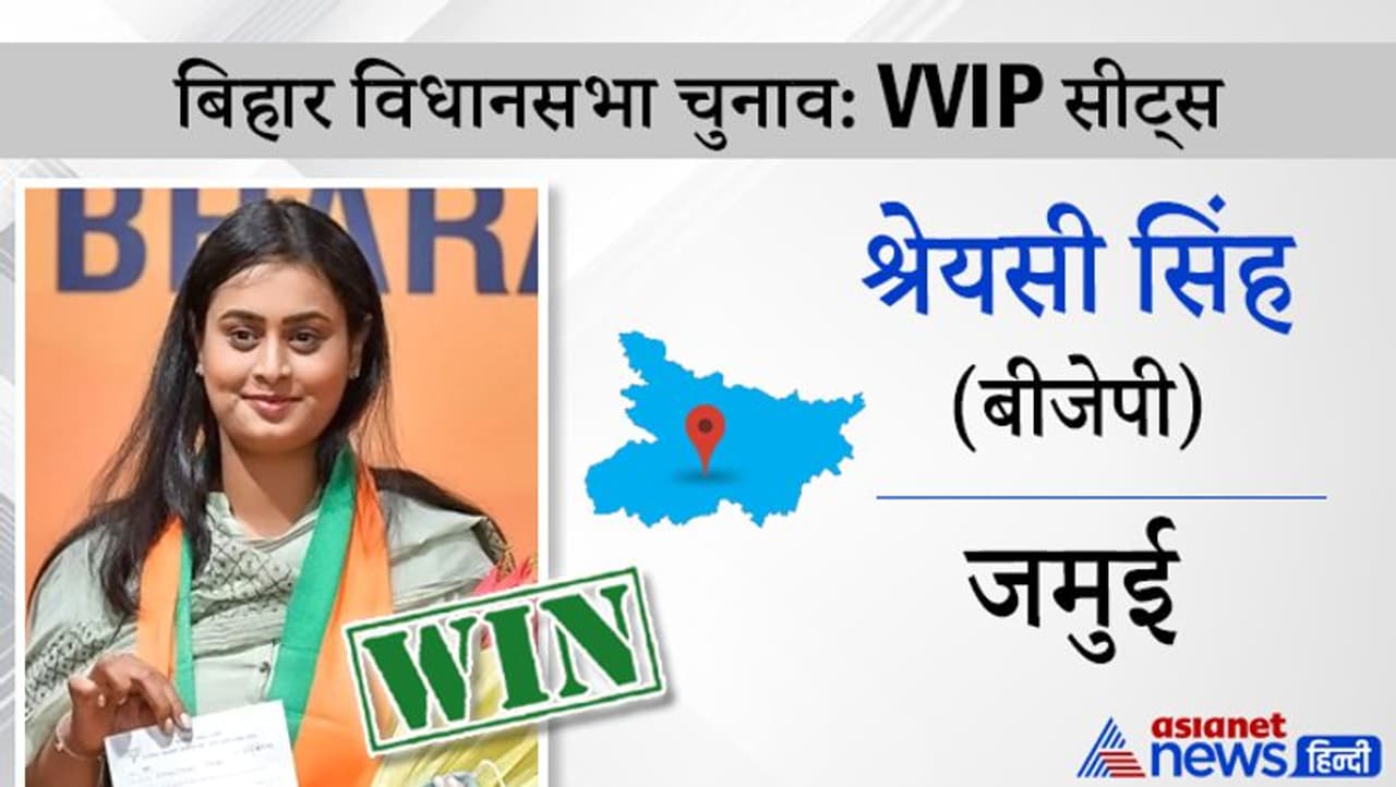 जमुई से श्रेयसी सिंह की जीत- जमुई सीट बिहार की हॉट सीट की लिस्ट में शामिल है। भाजपा उम्मीदवार नेशनल शूटर श्रेयसी सिंह को 71 हजार से ज्यादा वोट मिले। इन्होंने राजद प्रत्याशी को हराया।