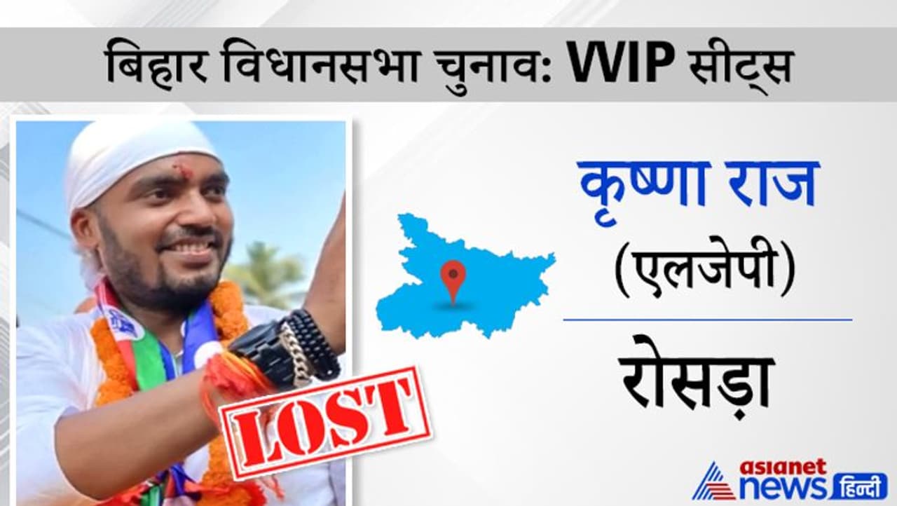 रोसड़ा विधासनभा सीट से LJP प्रत्याशी कृष्णा राज की हारः कृष्ण राज तीन नंबर पर पहुंच सके। उनको कांग्रेस और बीजेपी प्रत्याशी के हाथों हार का सामना करना पड़ा। बीजेपी को 87 हजार से ज्यादा वोट, जबकि कांग्रेस प्रत्याशी को 51 हजार से ज्यादा वोट मिले। कृष्णा राज को लगभग 23 हजार वोट मिला।