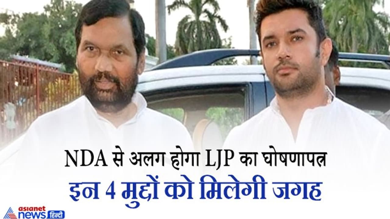 पटना। विधानसभा चुनाव से पहले एलजेपी और जेडीयू का झगड़ा बीजेपी की मध्यस्थता के बाद थमता दिख रहा है। हालांकि अभी भी एनडीए में अपनी भूमिका को लेकर एलजेपी नेता चिराग पासवान बहुत संतुष्ट नजर नहीं आ रहे हैं। इसके संकेत पार्टी के उस रुख से भी मिल रहा है जिसमें एलजेपी का घोषणापत्र एनडीए से अलग बनाए जाने की चर्चा है। पार्टी चार बड़े मुद्दों को घोषणापत्र में जगह देगी जो चिराग की भविष्य की राजनीति के मद्देनजर तैयार किए गए लगते हैं।