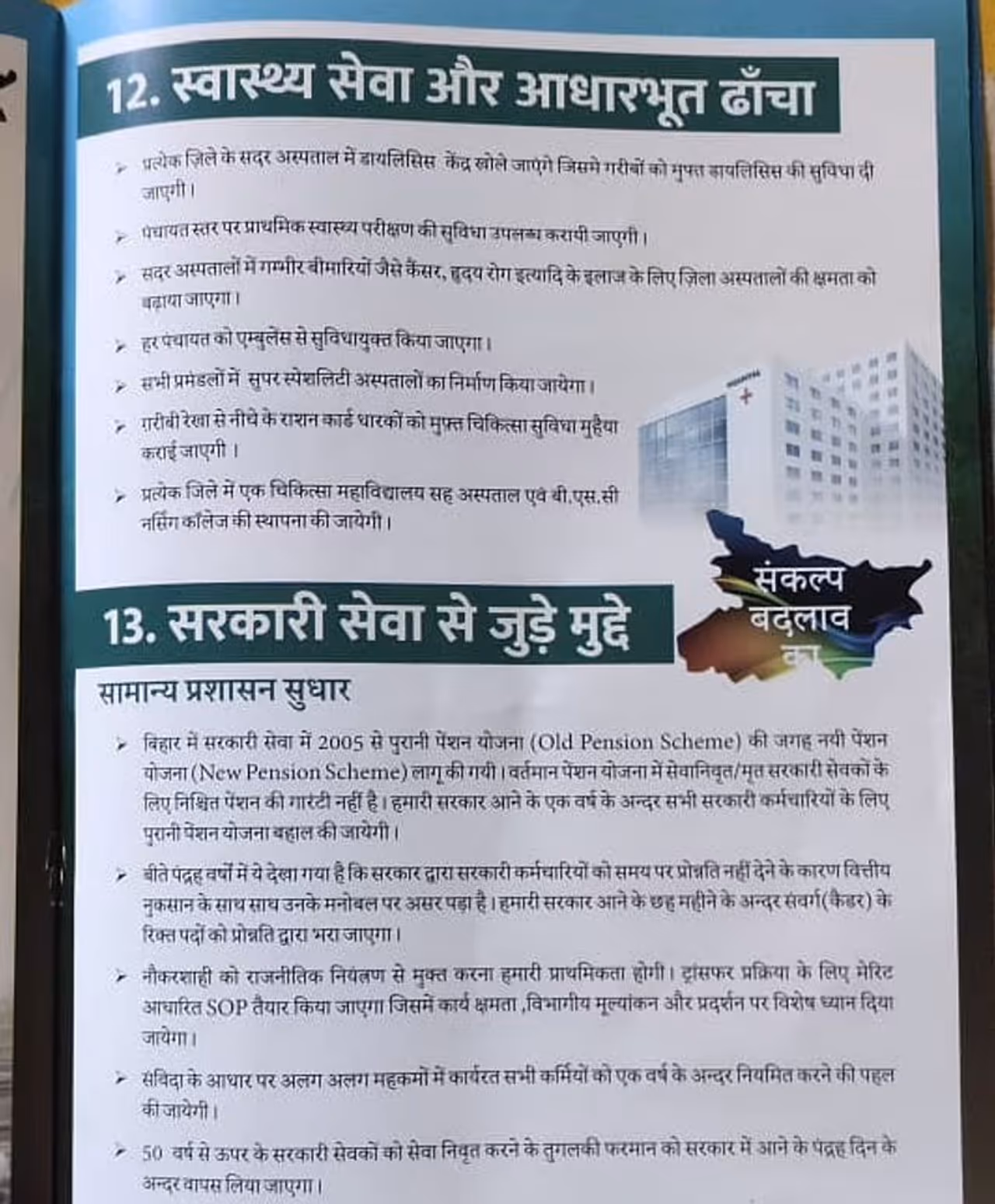 इसमें बिहार में सरकार बनाने के बाद कई लोकलुभावन वादों को पूरा करने का वचन दिया गया है। घोषणापत्र को "प्रण हमारा संकल्प बदलाव का" नाम दिया गया है।