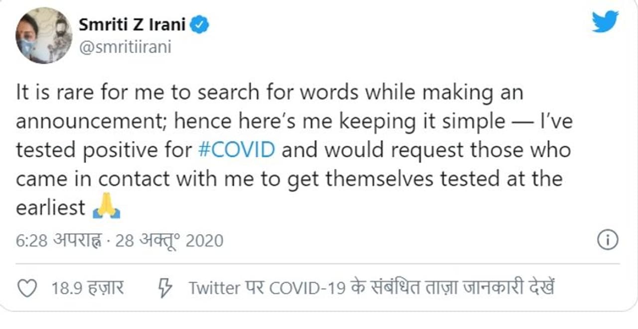 केंद्रीय मंत्री ने अपने ट्वीट में लिखा कि मैं कोरोना संक्रमित पाई गई हूं। इसकी घोषणा करने के लिए मेरे पास शब्द नहीं हैं। आगे लिखा कि बीते कुछ दिनों में जितने भी लोग मेरे करीब आए हैं, वे अपना जांच जरूर करा लें और खुद को क्वारंटाइन कर लें।