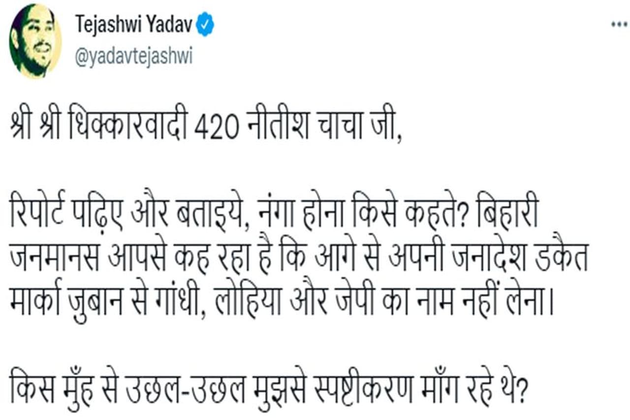 नवंबर 2018 में सोशल मीडिया में तेजस्वी यादव का एक ट्वीट सोशल मीडिया में जमकर वायरल हुआ था। इस ट्वीट में तेजस्वी यादव पर जोरदार हमला करते हुए उन्हें धिक्कारवादी और 420 तक कहा था। तेजस्ववी यादव ने ट्वीट करते हुए कहा था- श्री श्री धिक्कारवादी 420 नीतीश चाचा जी, रिपोर्ट पढ़िए और बताइये, नंगा होना किसे कहते? बिहारी जनमानस आपसे कह रहा है कि आगे से अपनी जनादेश डकैत मार्का ज़ुबान से गांधी, लोहिया और जेपी का नाम नहीं लेना। किस मुँह से उछल-उछल मुझसे स्पष्टीकरण मांग रहे थे?