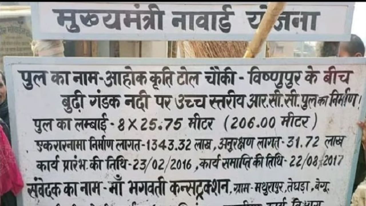 बिहार के बेगूसराय में गंडक नदी पर बना पुल बीच से टूट कर नदी में समा गया। मुख्यमंत्री नाबार्ड योजना के तहत आहोक कृति टोल चौकी और विष्णुपुर के बीच 1343.32 लाख रुपए निर्माण लागत वाला यह 'उच्चस्तरीय आरसीसी पुल’फरवरी 2016 में बनना शुरू हुआ था