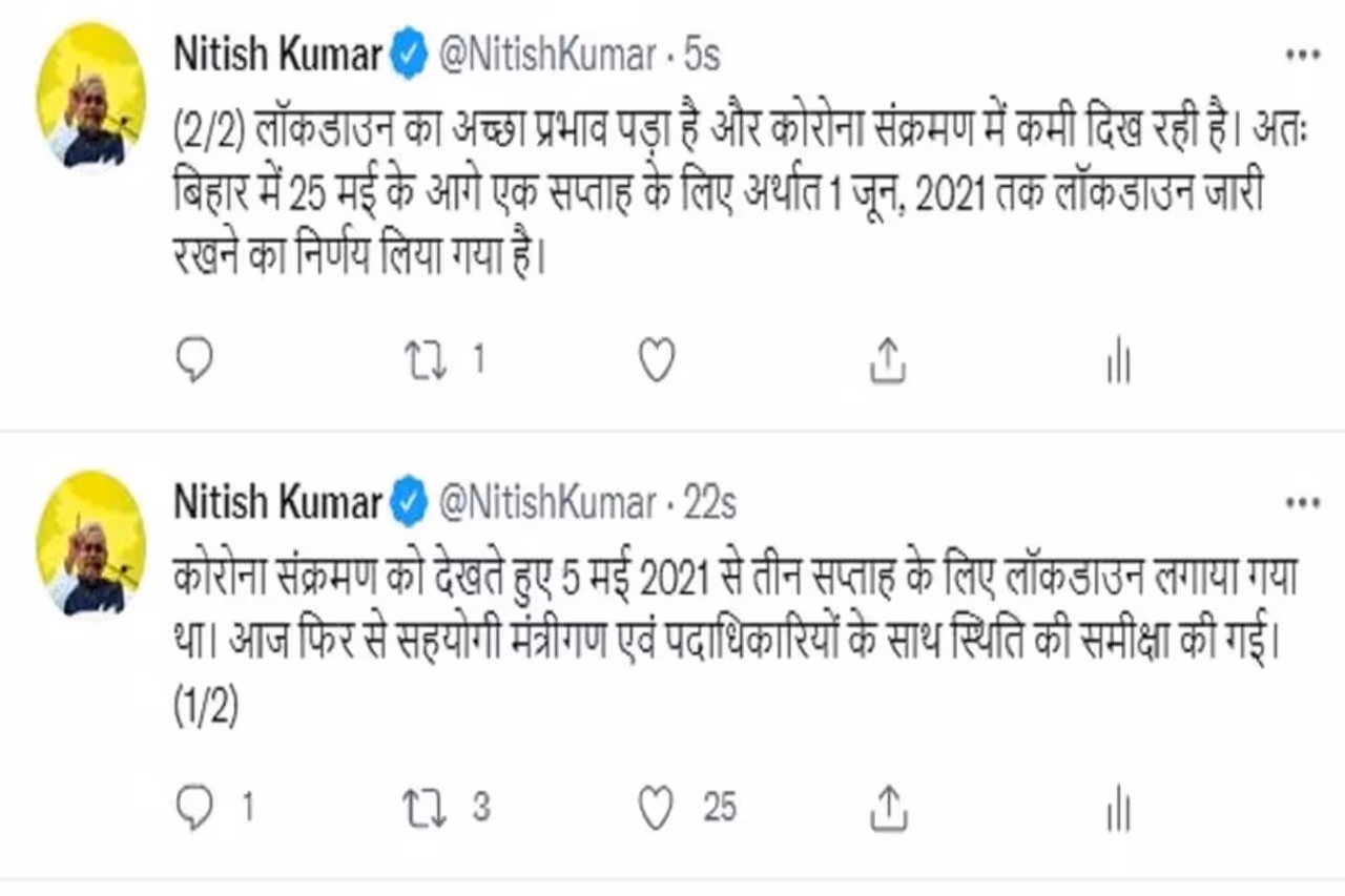 पटना (Bihar) । बिहार में जारी लॉकडाउन को बढ़ा दिया गया है। अब 1 जून 2021 तक होगी। जिसकी जानकारी सोमवार को खुद मुख्यमंत्री नीतीश कुमार ने ट्टीट कर दिया है। बता दें कि इसके पहले बिहार में 25 मई तक लॉकडाउन लागू किया गया था।