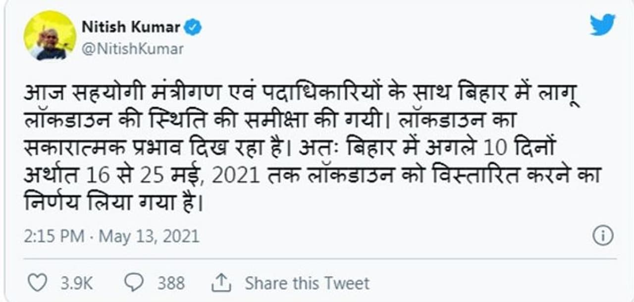 पटना (Bihar) । मुख्यमंत्री नीतीश कुमार ने 15 मई को खत्म हो रहे लॉकडाउन को 25 मई तक बढ़ा दिया गया है। इसकी जानकारी उन्होंने खुद ट्टीट कर दी है। यह निर्णय कोरोना वायरस के संक्रमण को देखते हुए लिया है। सरकार का दावा है कि करीब तीन हफ्ते के बाद राज्य में कोरोना के एक दिन में मिलने वाले नए मरीजों की संख्या 10 हजार से नीचे गई है। इसी के साथ कुल एक्टिव मरीजों की संख्या भी एक लाख से कम हो गई है। रिकवरी रेट में सुधार हुआ है, वहीं संक्रमण की दर भी घटी है।