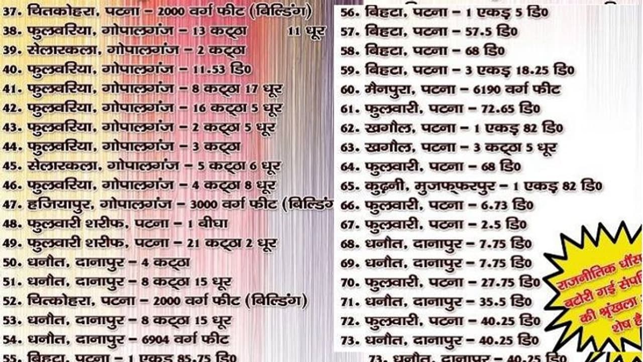 इस पोस्टर में 73 ऐसे संपत्ति अर्जित करने का आरोप है, जो लालू ने कथित तौर पर भ्रष्टाचार करके कमाया है। इस पोस्टर में लालू प्रसाद यादव समेत पूर्व मुख्यमंत्री राबड़ी देवी, उनकी बेटी मीसा भारती और दोनों बेटे तेजस्वी तथा तेजप्रताप यादव की तस्वीर भी है।