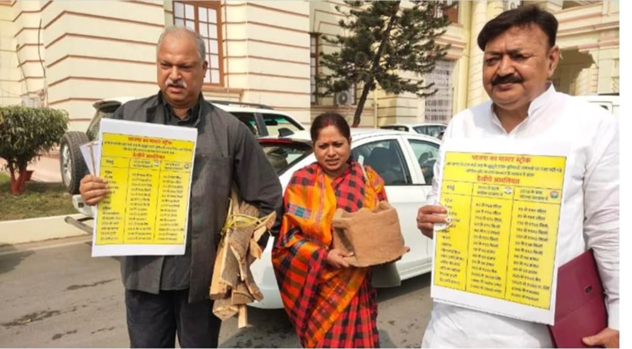 कांग्रेस विधायक शकील अहमद खान मिट्टी का चूल्हा और लकड़ी लेकर विधानसभा पहुंचे। उनका कहना था कि वह इसे सरकार को भेंट करेंगे। शकील अहमद खान के साथ विधायक प्रतिमा कुमार और अजीत शर्मा ने भी प्रदर्शन किया।