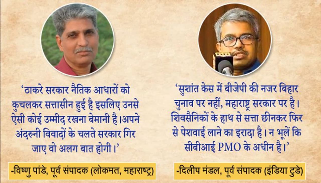 इंडिया टुडे के पूर्व संपादक दिलीप मंडल दावा करते हैं, "सुशांत केस में बीजेपी की नजर बिहार चुनाव पर नहीं, महाराष्ट्र सरकार पर है। शिवसैनिकों के हाथ से सत्ता छीनकर फिर से पेशवाई लाने का इरादा है। न भूलें कि सीबीआई PMO के अधीन है।" अपनी बात को पुख्ता करते हुए वो यह भी कहते हैं, "सुशांत केस की वजह से बिहार में एक भी वोटर अपना वोट डालने का निर्णय नहीं बदलने वाला है। नीतीश कुमार और तेजस्वी यादव दोनों ने सीबीआई जांच की मांग की थी। इसे लेकर कोई राजनीति बिहार में नहीं हो सकती। सुशांत मामले में पक्ष और विपक्ष वहां एक ही राय रखता है। निशाना महाराष्ट्र है।"