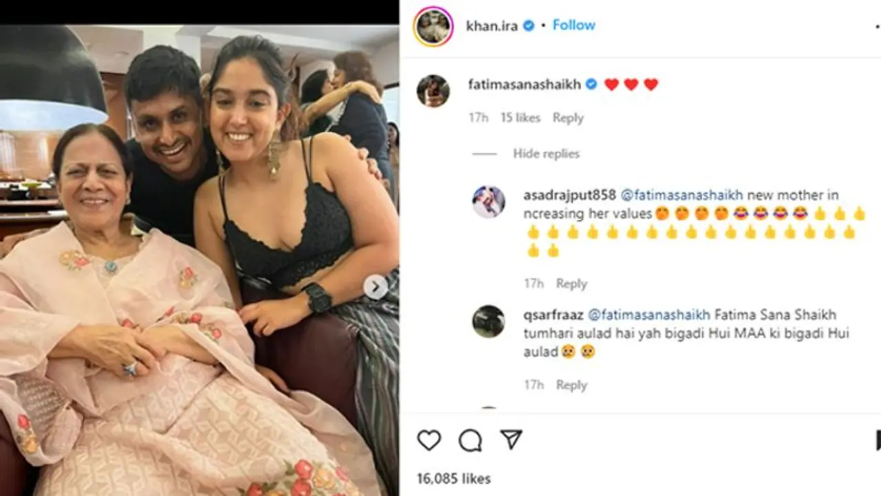 इतना ही नहीं यूजर्स ने इस पोस्ट पर हार्ट शेप इमोजी कमेंट करने वाली एक्ट्रेस फातिमा सना शेख को भी नहीं छोड़ा। फातिमा के कमेंट का रिप्लाय देते हुए एक यूजर ने लिखा, 'फातिमा सना शेख तुम्हारी औलाद है यह। बिगड़ी हुई मां की बिगड़ी हुई औलाद।' वहीं एक अन्य यूजर ने लिखा, 'नई मां अपनी पहचान बना रही है।' बता दें कि जब से आमिर खान ने अपनी दूसरी पत्नी रीना राव को तलाक दिया है तभी से इंडस्ट्री में चर्चा है कि फातिमा, आमिर को डेट कर रही हैं।