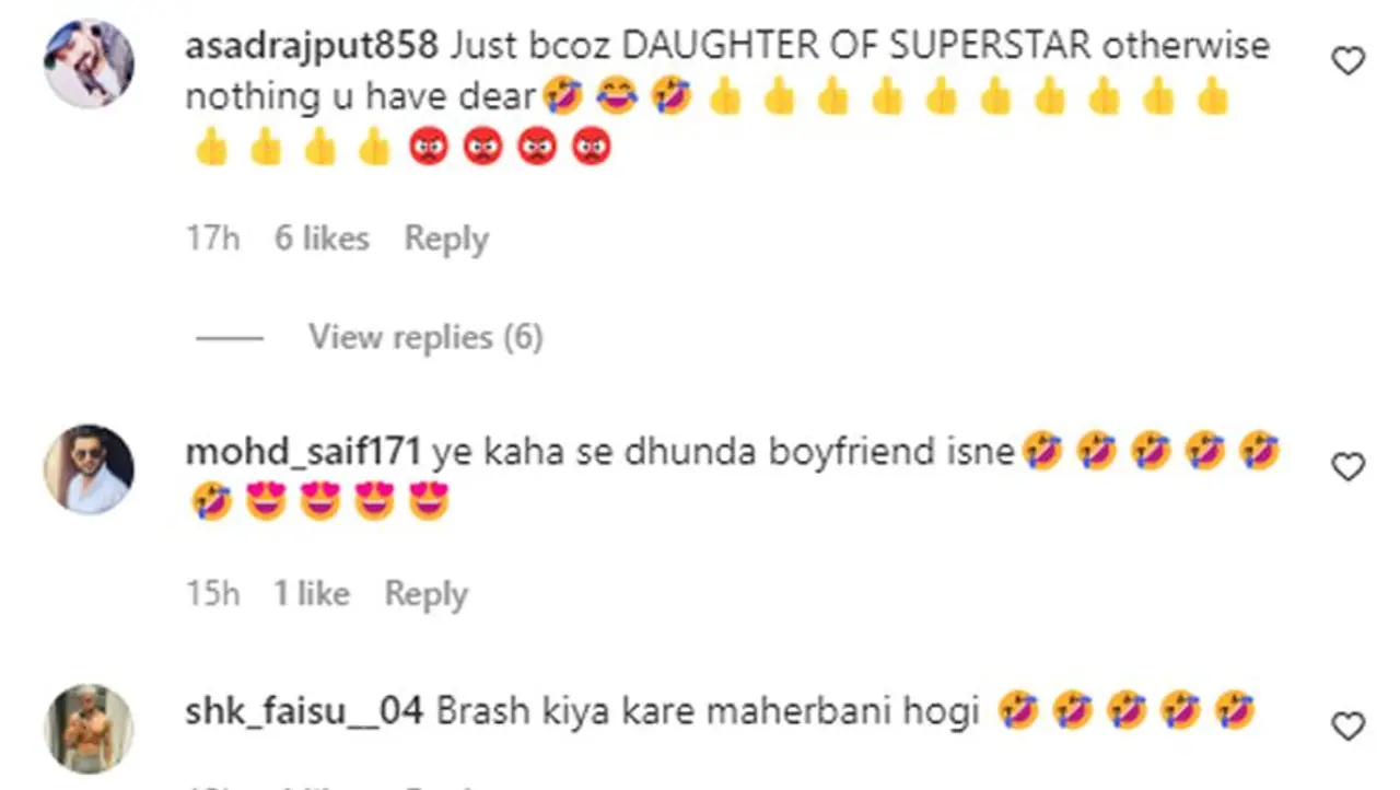इस तस्वीर पर आइरा को ट्रोल करते हुए एक यूजर ने लिखा, 'अगर आप सुपरस्टार की बेटी नहीं होती तो आपको यह भी नहीं मिलता।' वहीं एक यूजर ने लिखा, 'ये कहां से ढूंढा बॉयफ्रेंड इसने।' वहीं एक अन्य यूजर ने आइरा से कहा, 'आप ब्रश किया करें, बड़ी मेहरबानी होगी।' इसके अलावा कई यूजर्स ने आइरा से यह भी पूछा कि क्या वे नुपुर से शादी करने जा रही हैं?