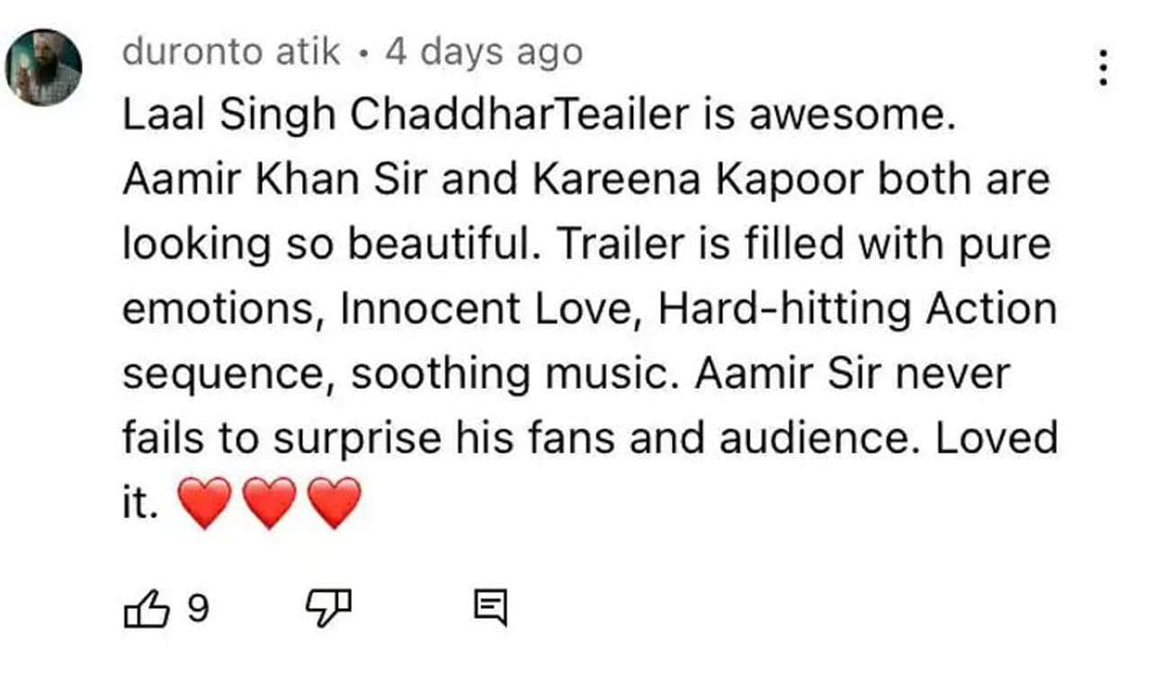 वहीं, एक यूजर ने लिखा, 'लाल सिंह चड्ढा का ट्रेलर शानदार है। आमिर खान सर,करीना कपूर दोनों बहुत खूबसूरत लग रहे हैं। ट्रेलर प्योर लव,इमोशन ,खूबसूरत म्यूजिक, हार्ट हिटिंग एक्शन से भरा पड़ा है। आमिर खान अपने ऑडियनश और चाहनेवालों को सरप्राइज करने से निराश नहीं करते हैं।