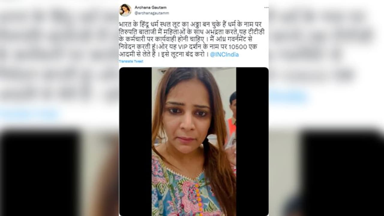 अर्चना ने कांग्रेस को टैग करते हुए कैप्शन में लिखा है, "भारत के हिंदू धर्म स्थल लूट का अड्डा बन चुके हैं। धर्म के नाम पर तिरुपति बालाजी मैं महिलाओं के साथ अभद्रता करते, यह टीटीडी के कर्मचारी पर कार्यवाही होनी चाहिए । मैं आंध्र गवर्नमेंट से निवेदन करती हूं। ओर यह VIP दर्शन के नाम पर 10500 एक आदमी से लेते है । इसे लूटना बंद करो ।"