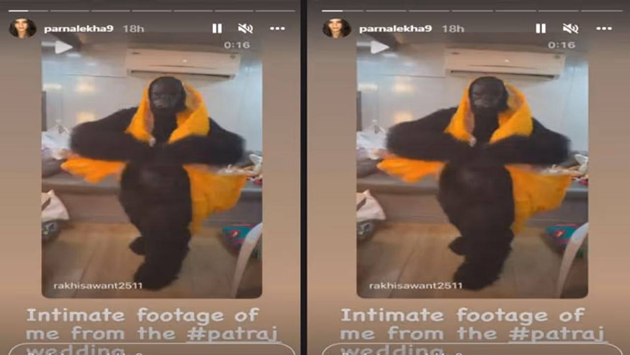 वीडियो में राखी पूरे तरह से गोरिल्ला के कॉस्ट्यूम में दिख रही हैं साथ ही उन्होंने पीले रंग का दुपट्टा पहना हुआ है। इसके साथ ही वह चोली के पीछे क्या है गाती और नाचती नजर आ रही हैं। अब इसी वीडियो को साझा करते हुए पर्णनालेखा ने लिखा- #पत्रराज की शादी का इंटीमेट वीडियो।