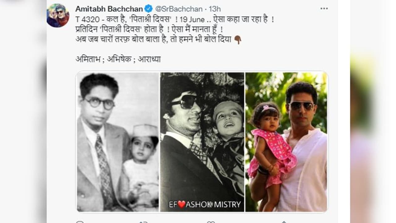 एंटरटेनमेंट डेस्क. दुनियाभर में आज पिता के सम्मान का दिन 'फादर्स डे' (Father's Day) धूमधाम से मनाया जा रहा है। महानायक अमिताभ बच्चन (Amitabh Bachchan) ने एक दिन पहले ही सोशल मीडिया पर अपनी चार जनरेशन (पिता, स्वयं, बेटा और पोती) की तस्वीरें शेयर कर इस बारे में पोस्ट लिखी है। बिग बी ने लिखा है, "कल है पिताश्री दिवस!19 जून। ऐसा कहा जा रहा है। प्रतिदिन पिताश्री दिवस होता है। ऐसा मैं मानता हूं। चारों तरफ बोलबाला है तो हमने भी बोल दिया। अमिताभ-अभिषेक-आराध्या।"