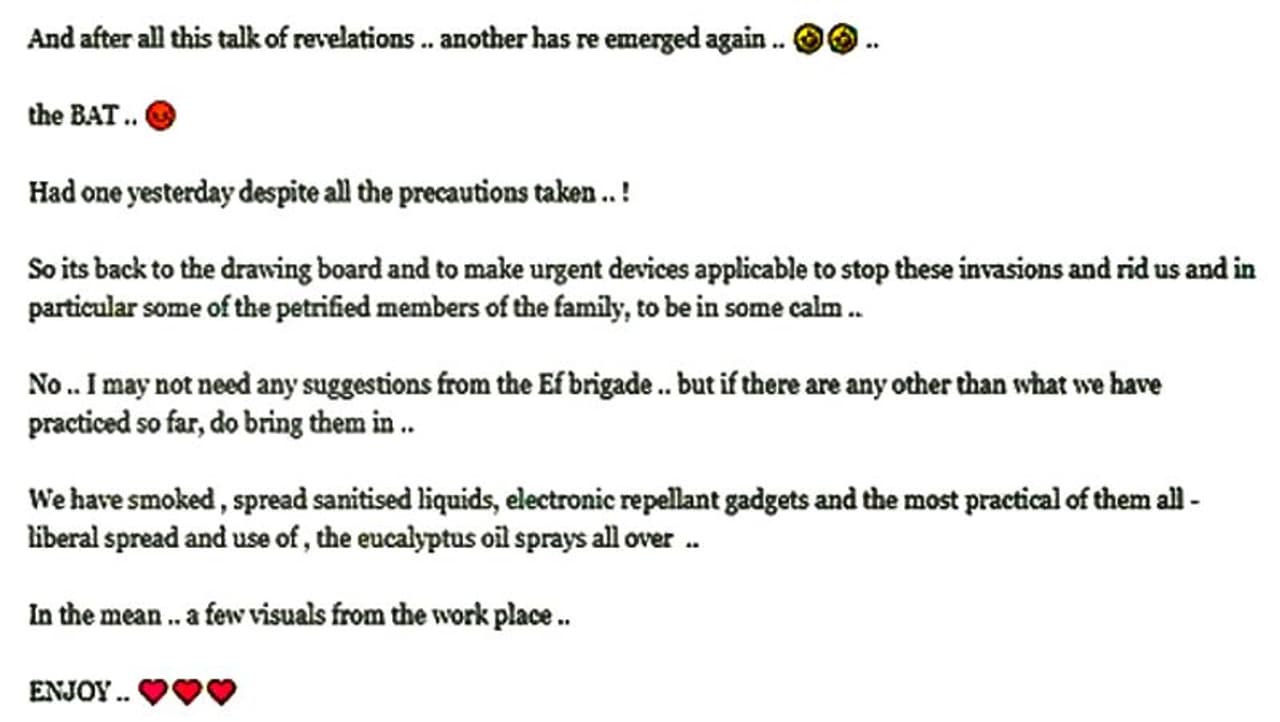 अमिताभ बच्चन ने आगे लिखा, "सभी जरूरी डिवाइस इकट्ठा किए जाने लगे जो चमगादड़ को रोकने और उनसे छुटकारा दिलाए और डरे सहमे घरवालों को राहत दे। नहीं...मुझे ईएफ ब्रिगेड से कोई सलाह नहीं चाहिए...पर आपके पास कुछ नया है ,जो हमने आज तक ट्राई नहीं किया है तो उसे जरूर हमारे सामने लाएं। हमने धुंआ किया, सैनिटाइज्ड लिक्विड छिड़का, इलेक्ट्रॉनिक रिपेलेंट गैजेट और इन सबसे ज्यादा प्रैक्टिकल है-नीलगिरी के तेल का सभी जगह छिड़काव करना..।" इससे पहले बिग बी ने 2020 में एक पोस्ट शेयर की थी, जिसमें उन्होंने घर में चमगादड़ के घुसने की खबर बताई थी। इसमें अमिताभ ने लिखा था- देवियों और सज्जनों! इस घंटे की खबर, ब्रेकिंग न्यूज, क्या आप यकीन करेंगे? एक चमगादड़ जलसा में तीसरे फ्लोर पर, मेरे कमरे में घुस आया। बड़ी मुश्किल से उसे बाहर निकाला। कोरोना पीछा छोड़ ही नहीं रहा।