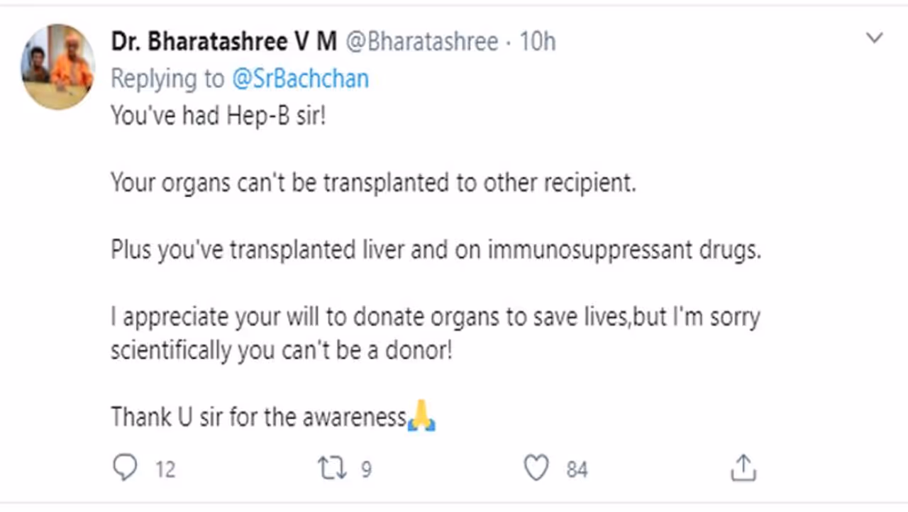 वहीं, एक यूजर ने लिखा कि आप साइंटिफिकली ऑर्गन डोनेट नहीं कर सकते, क्योंकि आपको हेपेटाइटिस-बी रहा है। आपके ऑर्गन्स किसी अन्य इंसान को नहीं लगाए जा सकते। इसके अलावा आप खुद का लिवर ट्रांसप्लांट करवा चुके हैं और इम्युनोसप्रेसेंट ड्रग्स लेते हैं। हालांकि मैं ऑर्गन्स डोनेट करने और दूसरों की जिंदगी बचाने के आपके फैसले की सराहना करता हूं।