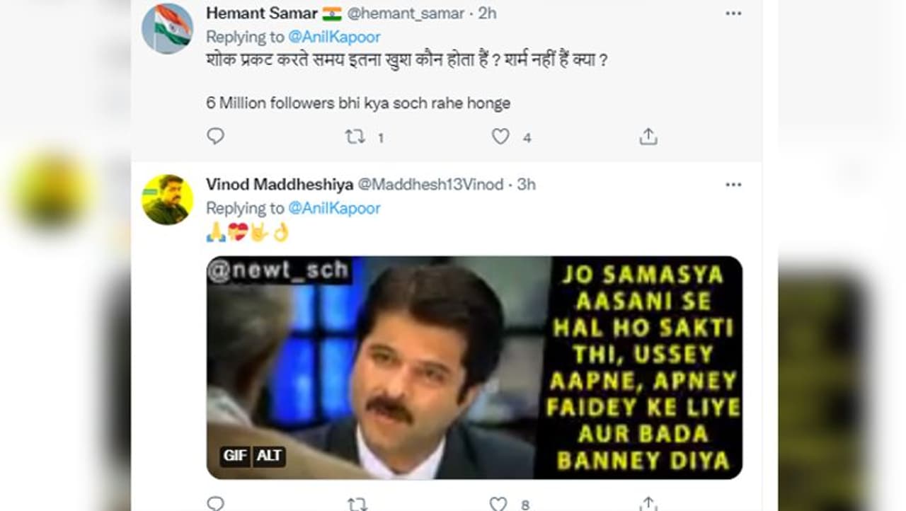 अनिल कपूर के ट्वीट पर कमेंट करते हुए एक सोशल मीडिया यूजर ने लिखा है, "शोक प्रकट करते समय इतना खुश कौन होता है? शर्म नहीं है क्या? 6 मिलियन फॉलोअर्स भी क्या सोच रहे होंगे?" एक यूजर ने अनिल की फिल्म नायक का डायलॉग पोस्ट किया है। उसने लिखा है, "जो समस्या आसानी से हल हो सकती थी, उसे आपने अपने फायदे के लिए और बड़ा बनने दिया।"