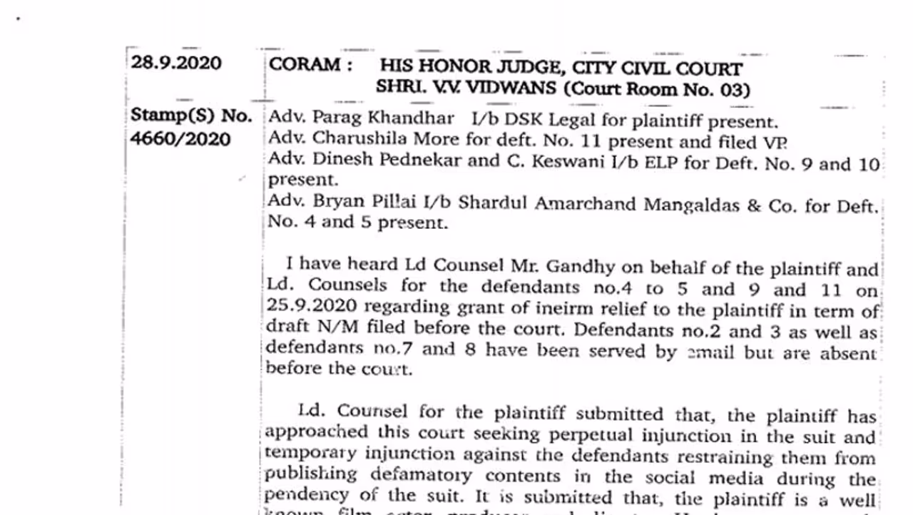 डीएसके लीगल के वकील प्रदीप गांधी ने अरबाज खान की तरफ से कोर्ट में केस पेश किया, जिसपर न्यायमूर्ति वी.वी. विदवान ने 'प्रतिवादियों को तुरंत ही यह बदनाम करने वाला पोस्ट हटाने/ वापस का आदेश दिया है। मुकदमे में कंटेंट और कोई भी अन्य बदनामी कंटेंट, जो प्रत्यक्ष या अप्रत्यक्ष रूप से किसी के भी द्वारा पोस्ट किया गया है और कोई भी अन्य पोस्ट, संदेश, ट्वीट, वीडियो, साक्षात्कार, संचार और बदनामी कंटेंट के समान पत्राचार ट्विटर, फेसबुक, यूट्यूब और अन्य माध्यमों सहित सभी सार्वजनिक डोमेन और सोशल मीडिया प्लेटफार्म पर अरबाज खान या उनके परिवार के सदस्यों के संबंध में किए गए अपमानजनक कंटेंट हटाने की बात कही गयी हैं'।